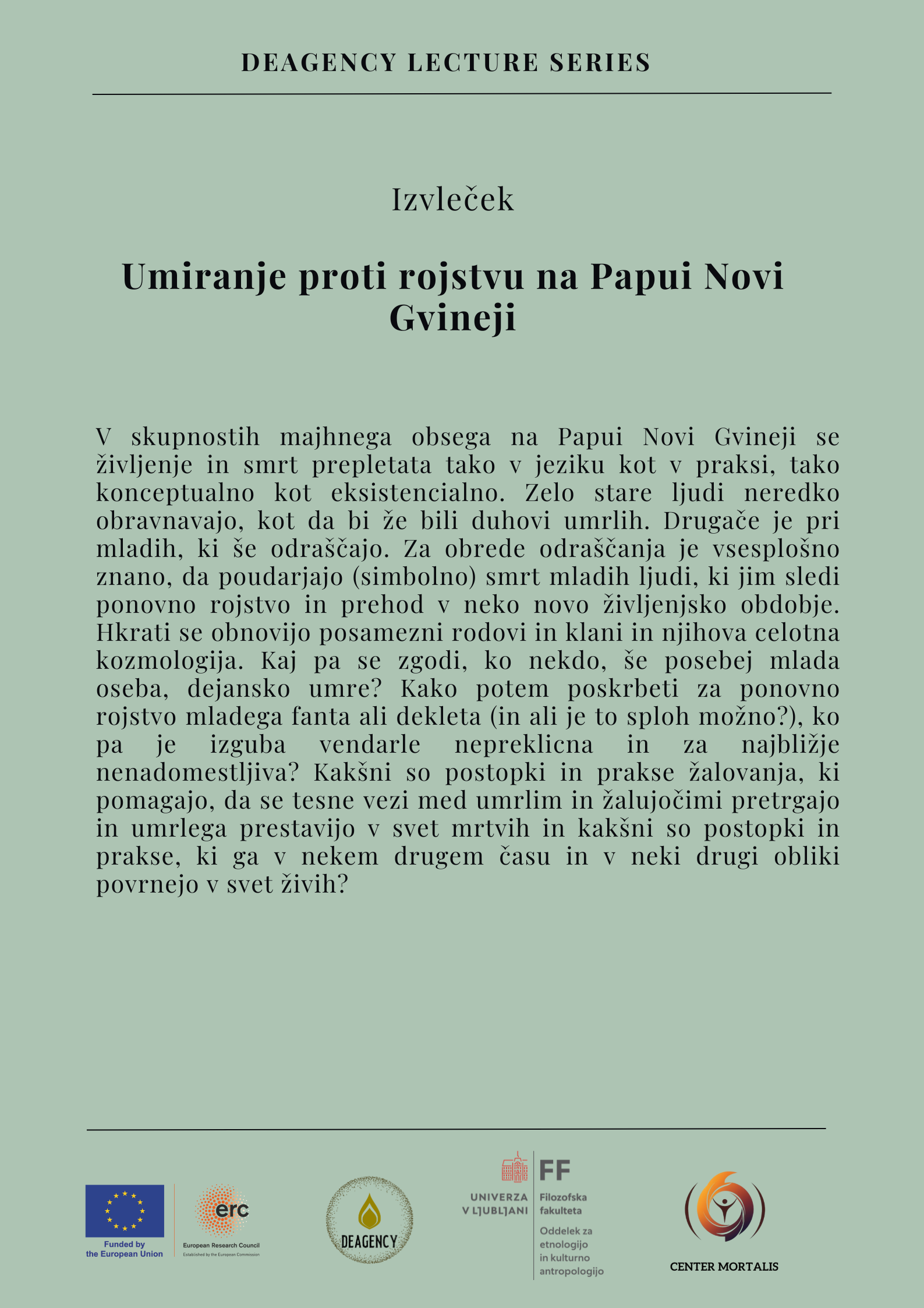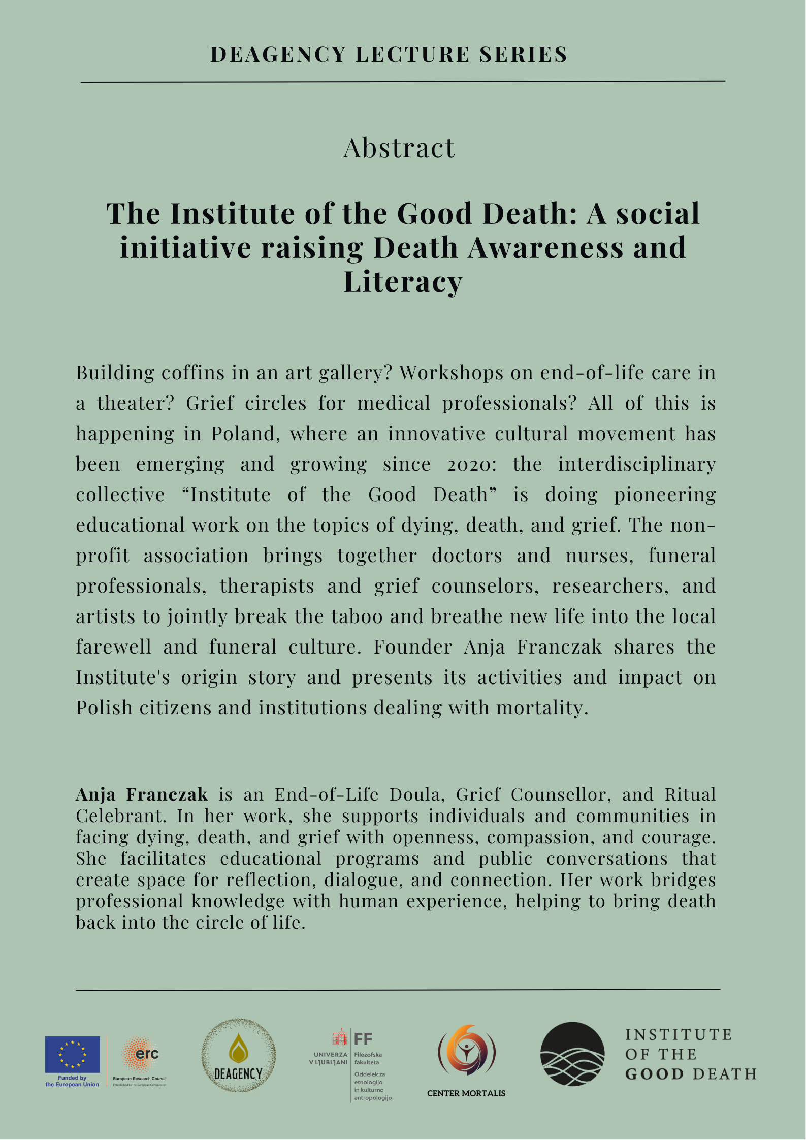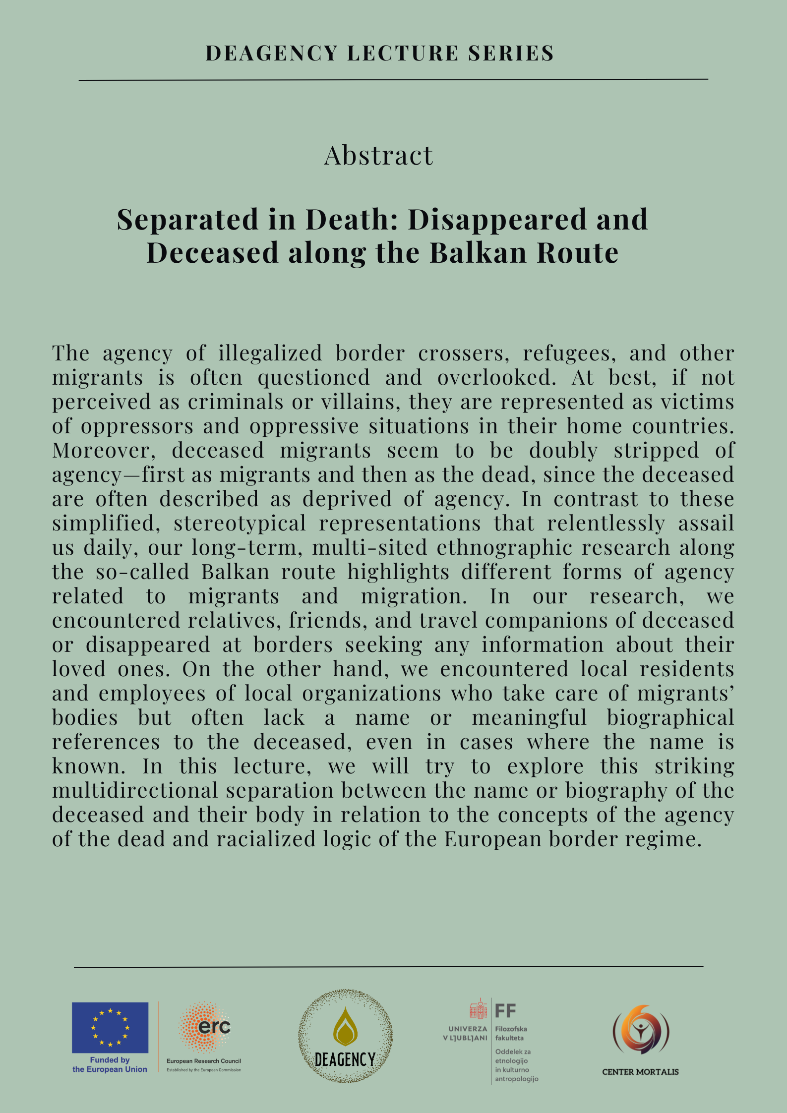 ERC project DEAGENCY (No 101095729) at the Department of Ethnology and Cultural Anthropology, Faculty of Arts, University of Ljubljana, Slovenia